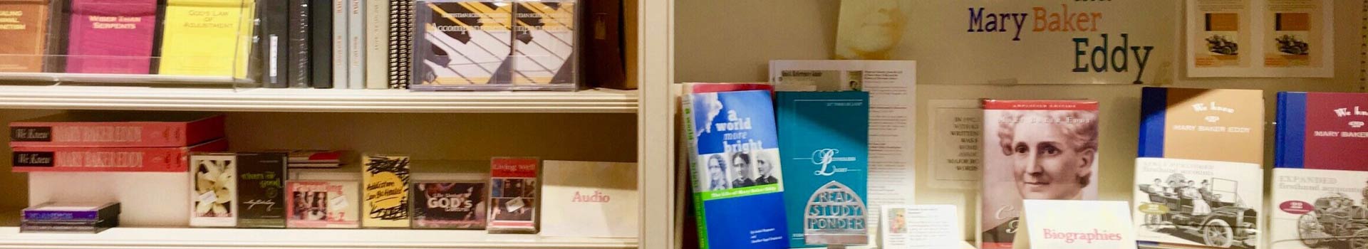 The sales area is well stocked with Bibles and reference books; Science and Health and other writings of Mary Baker Eddy; books and other materials for children; a variety of music and testimonial CDs and tapes; Christian Science magazines and pamphlets, as well as The Christian Science Monitor. Samples of these items are shown below.
